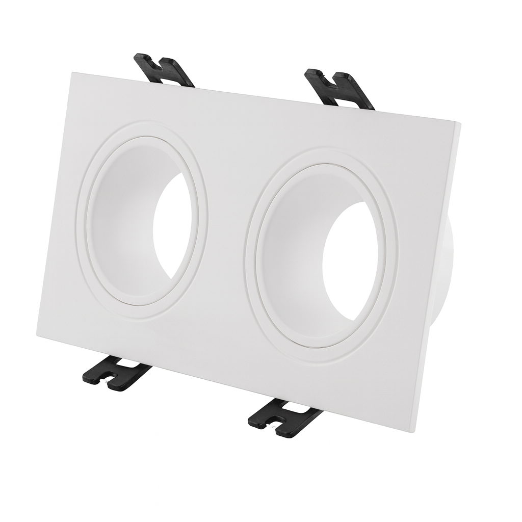 Marco empotrable rectangular basculante recesado para dos bombillos. Policarbonato blanco. Requiere hueco 160x80mm (exterior 173x93mm).